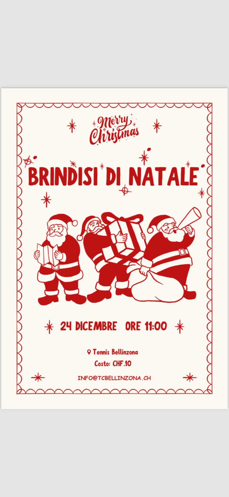 Siete tutti invitati all’aperitivo di Natale 2025 presso il Tennis Bar in data 24 dicembre 2025 alle ore 11:00. Costo CHF 10