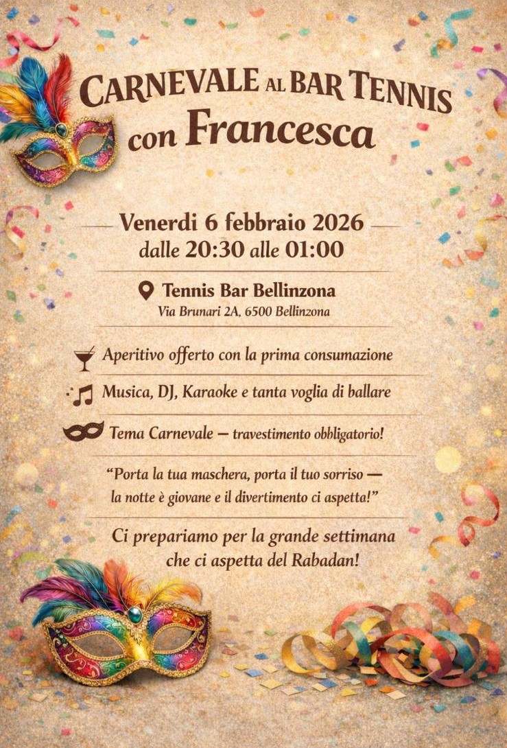 Carnevale con Francesca al Bar Tennis venerdì 6 febbraio 2026 a partire dalle ore 20:30. Aperitivo offerto con la prima consumazione